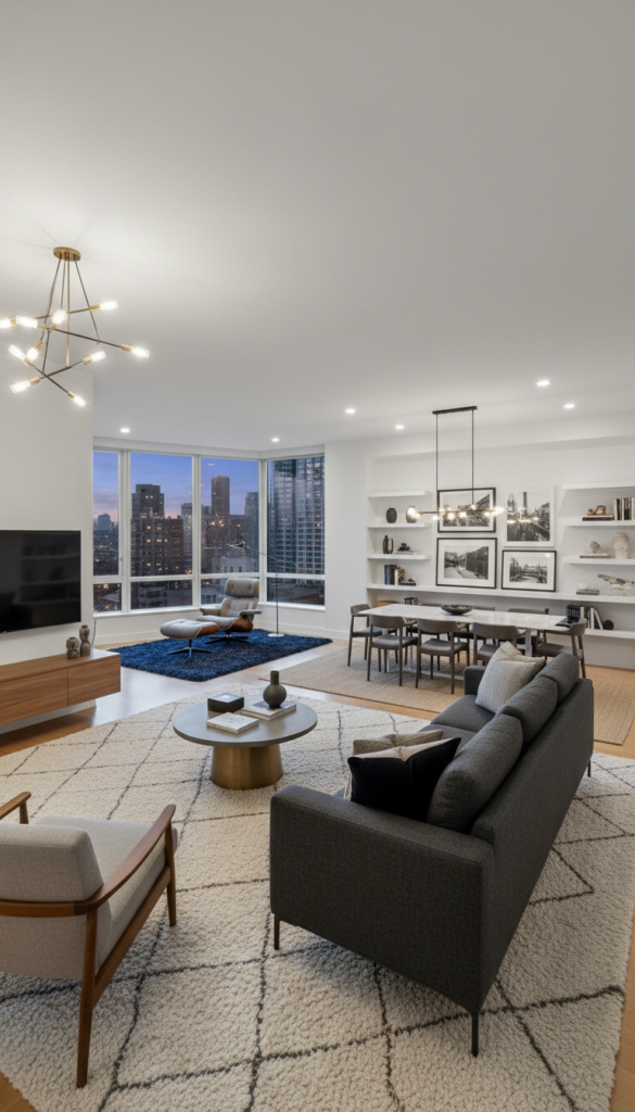 Master the art of open concept flow to define zones within a larger apartment living room. This design strategy creates distinct areas for various activities without using physical walls, maintaining an airy feel. It’s essential for living room designs apartment inspiration.Why it matters: An open concept layout enhances spaciousness and encourages interaction, making your apartment living room versatile and inviting. It creates a cohesive aesthetic living room.Achieve flow using:Area rugs to delineate spacesFurniture arrangement (e.g., a sofa facing away from a dining area)Strategic lighting fixturesLow-profile shelving units or console tablesThese techniques help create functional yet fluid spaces, making your apartment inspiration living room feel both grand and organized. This is key for dream apartment decor in larger layouts.