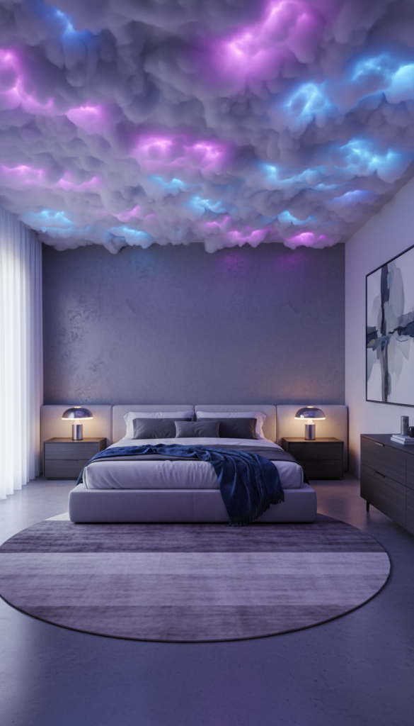 Nothing sets the tone for a vibey room aesthetic quite like custom lighting. A DIY cloud ceiling integrated with color-changing LED strips transforms a boring ceiling into a stormy, ethereal sky.