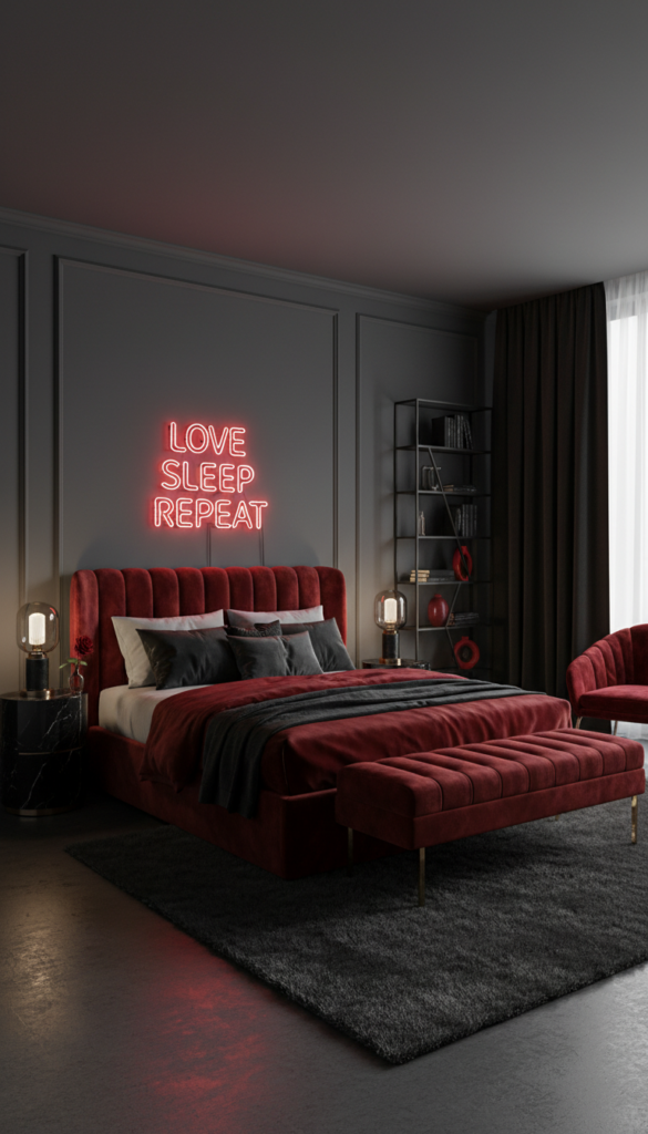 Get the look: Red velvet pillows, a red neon lip sign, or red under-glow lighting beneath the bed.