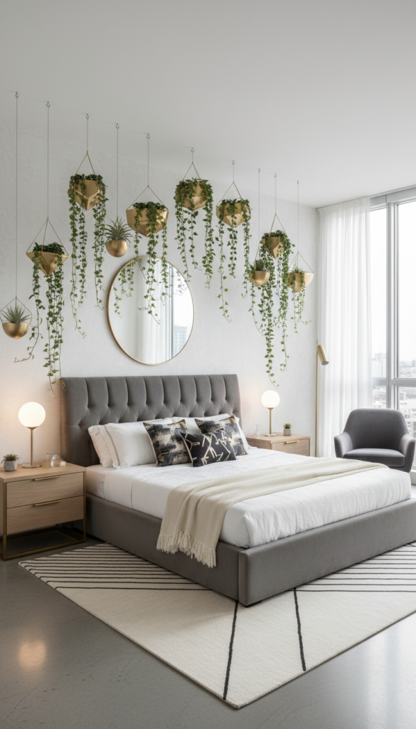 Visuals: Hanging ivy from the ceiling corners paired with gold geometric planters.