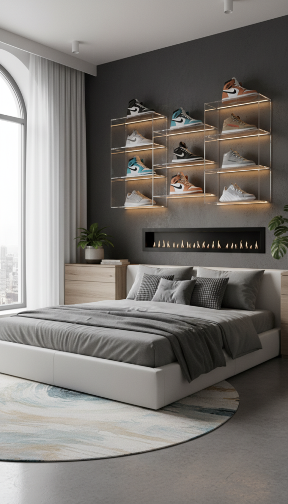 Showcasing your collection is a staple of the Boujee Room Aesthetic. Floating shelves dedicated to your pristine Jordans or designer heels turn footwear into wall art.