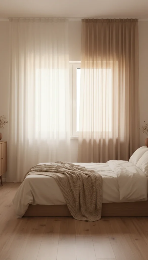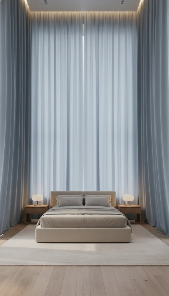 Instead of dressing only the window, try a full curtain wall. Floor-to-ceiling bedroom curtains across an entire wall instantly create a soft, cocoon-like feeling.