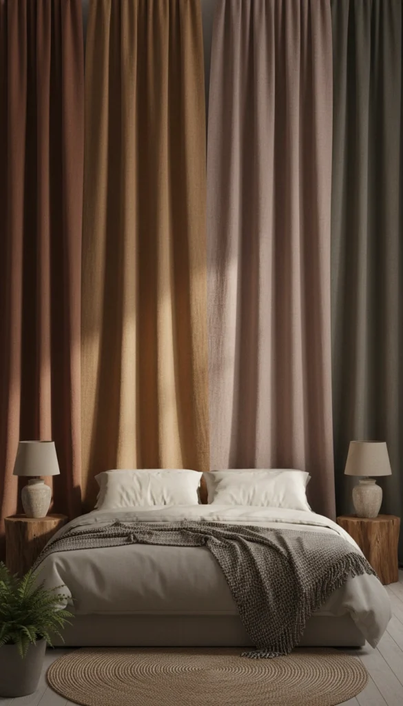 Linen instantly adds that relaxed, slow-morning vibe. Instead of defaulting to basic greys, try richer, earthy tones for your bedroom window coverings: