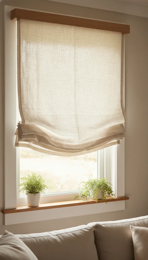 For smaller windows or spaces above a desk, simple window treatments such as relaxed Roman shades feel charming and tailored at the same time.