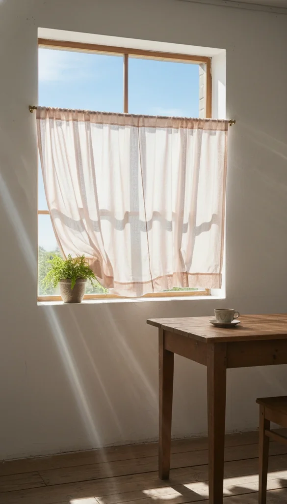 Mount a slim rod across the middle of the window frame. Use tiny clip rings for a soft, gathered top, then let the bottom hang clean and straight for a modern twist. Pair with a roller shade above the window if you want full darkness at night.