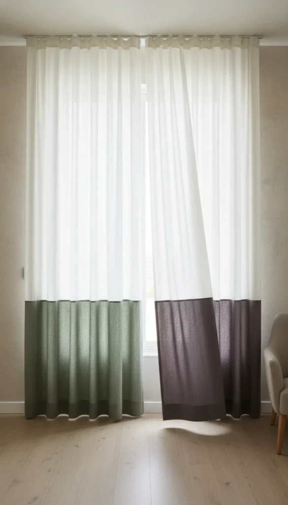 Color-blocked modern curtains feel like instant architecture. Two tones in one panel create a strong visual line and make the room look more designed.