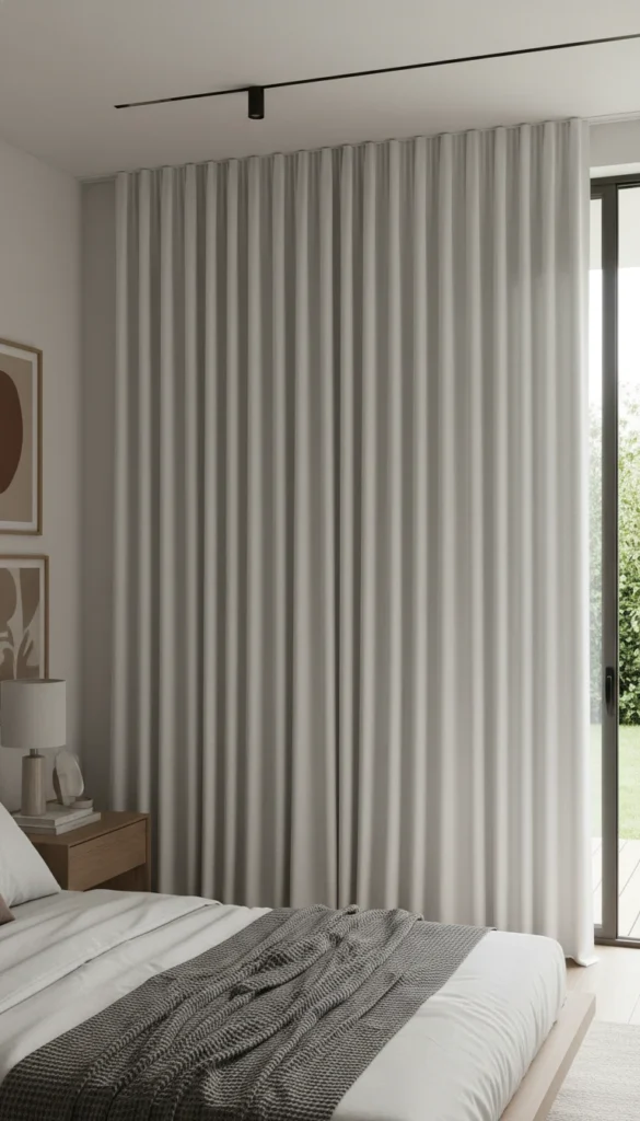 Install a low-profile ceiling track and let the panels overlap slightly in the middle. Position your bed against that wall so it looks like a custom, fabric headboard that stretches across the whole room.