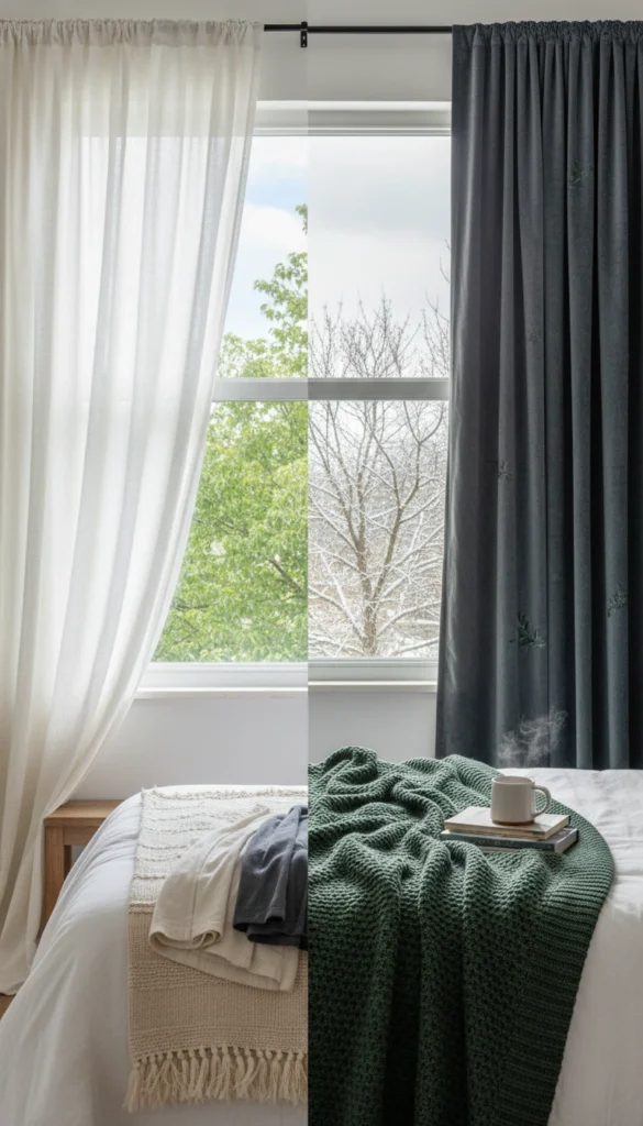 Use the same rod and rings for all sets so changing them feels easy. Store off-season panels neatly folded in labeled fabric bags or baskets. When you switch bedding or throws, swap the curtains too, and the room feels freshly styled with very little effort.