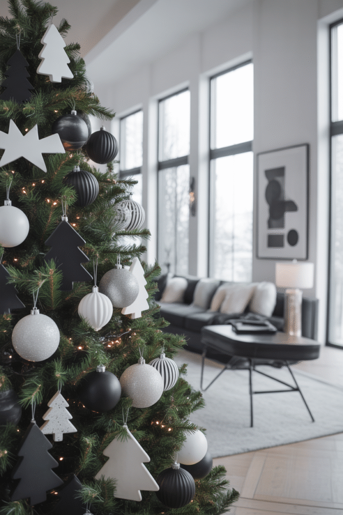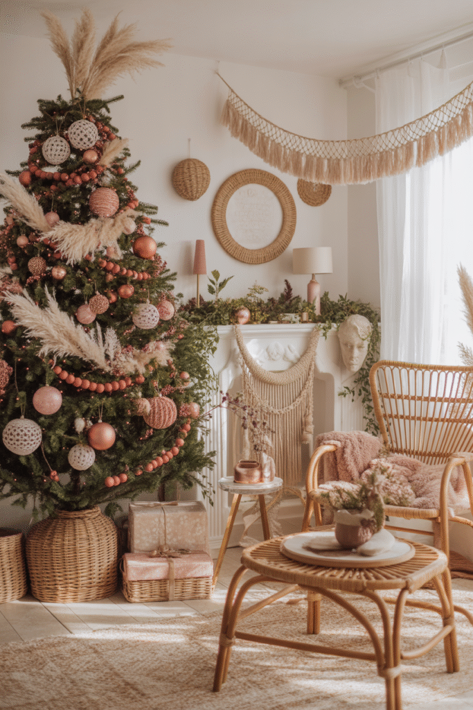 The biggest trend? Mixing modern and rustic elements. Picture a sleek white tree base wrapped in a woven basket, or shiny metallic ornaments hung beside hand-carved wooden stars. It’s about contrast: blending polish with personality.