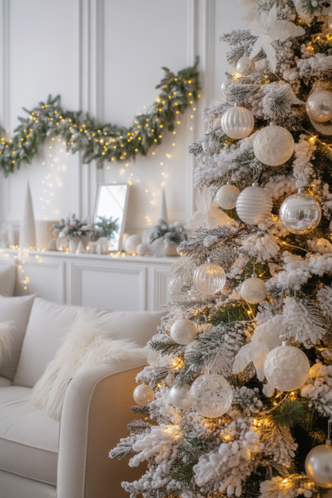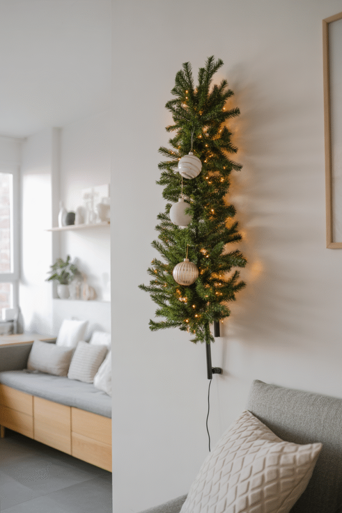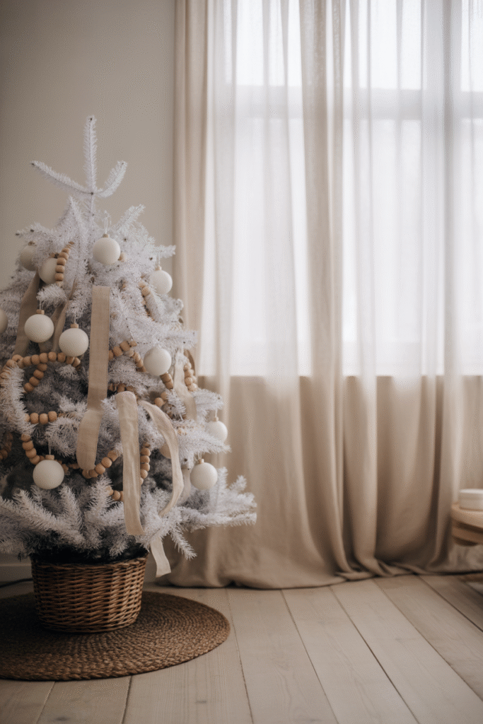 Use white ornaments, pale wood beads, and soft linen ribbons. A few sprigs of eucalyptus add a fresh, organic touch.