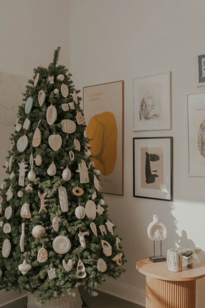 Turn your tree into a mini gallery. Mix ceramic ornaments, handmade crafts, and sculptural shapes.