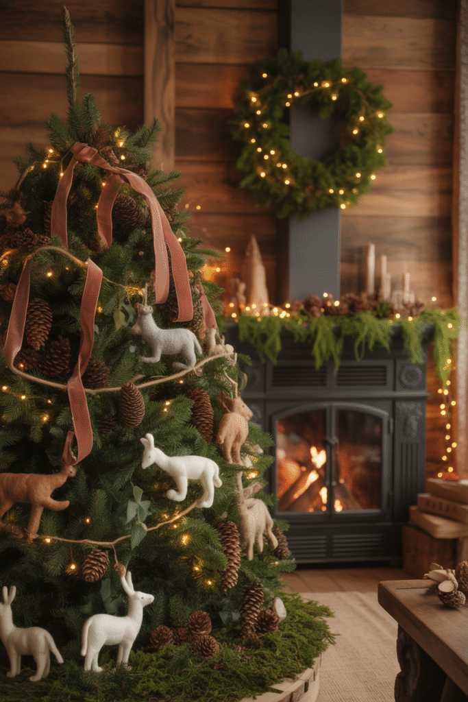 Combine pinecones, felt animals, and velvet ribbons in forest greens and rich browns.