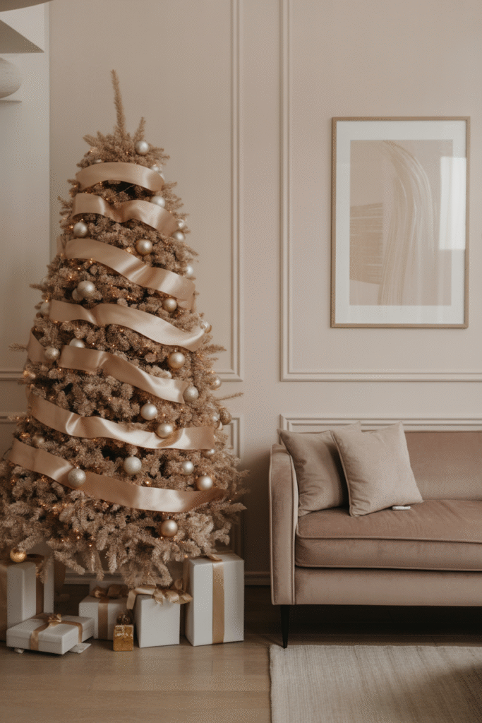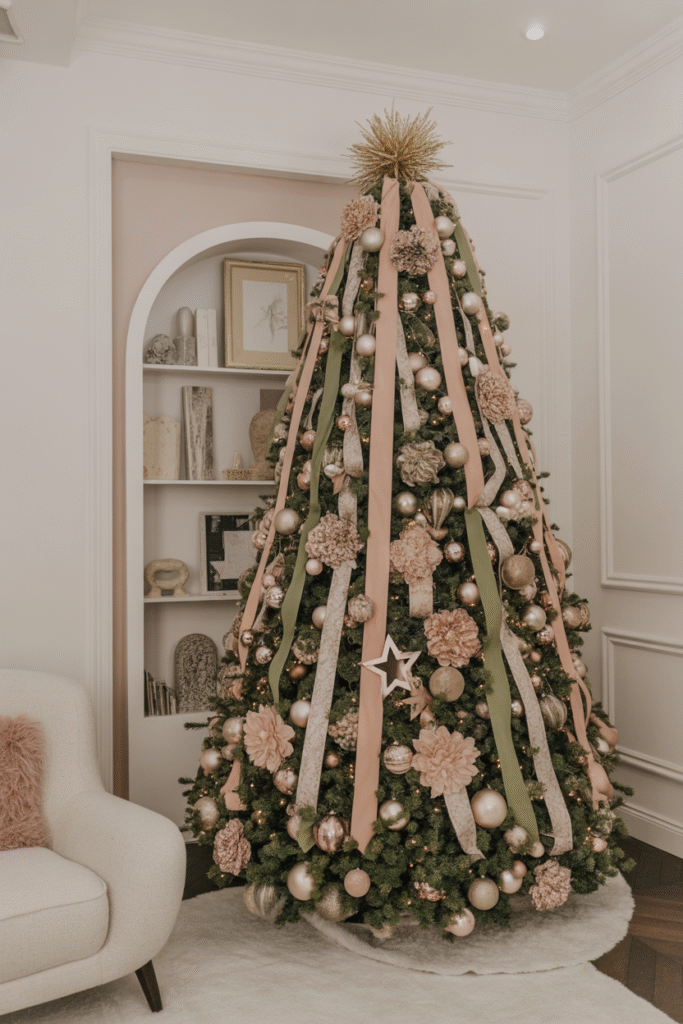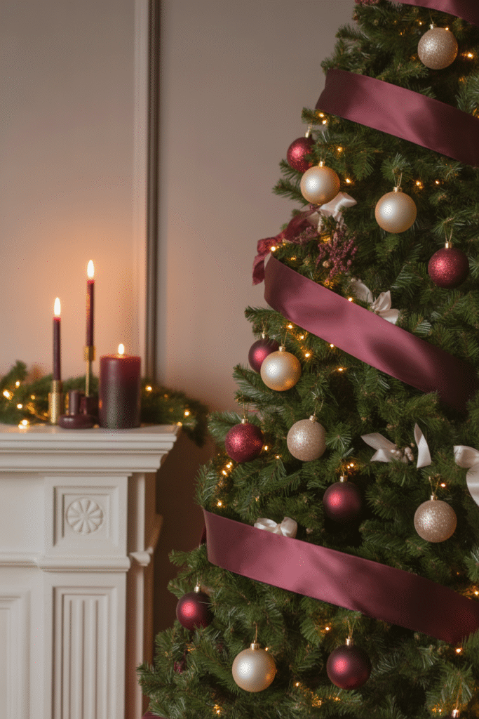 Use layered ribbons instead of tinsel, and keep ornaments oversized and fewer in number.