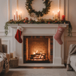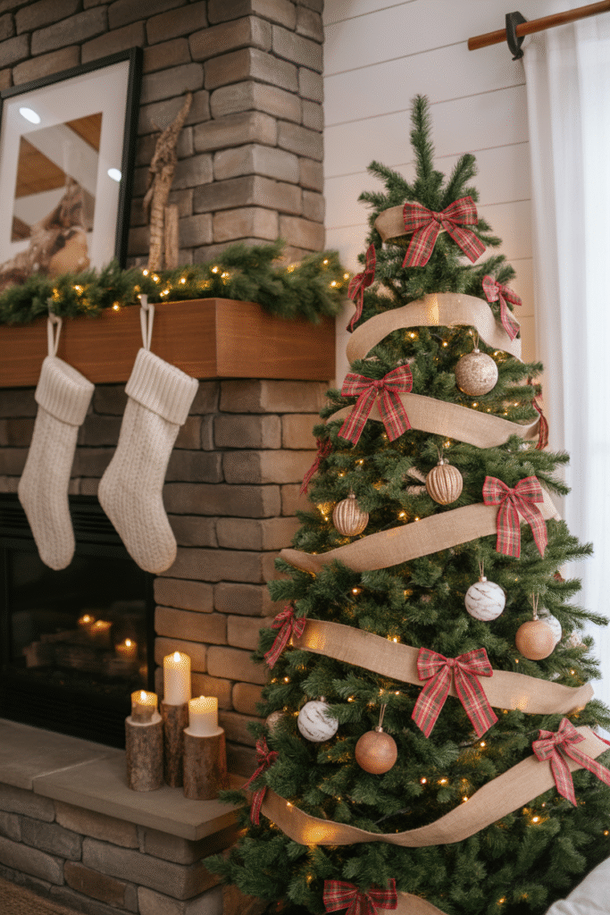 Rustic charm meets cozy storytelling. Layer burlap ribbons, plaid bows, and wooden ornaments shaped like stars or hearts.
