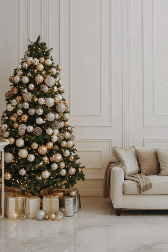 Mix gold, silver, and champagne ornaments, but vary the finishes — a little mirror, a little matte, a hint of glitter.