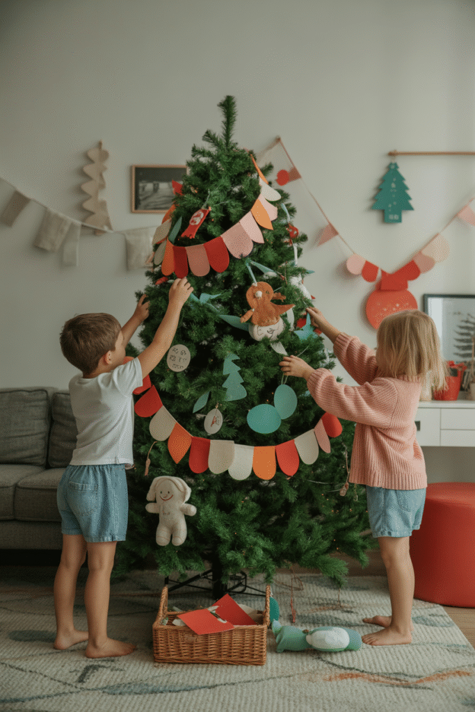 Decorate with colorful felt ornaments, paper garlands, and story-based themes (e.g., The Nutcracker or Winter Animals).