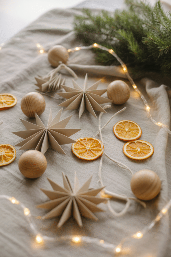 Use dried orange slices, cinnamon sticks, and paper stars instead of plastic.