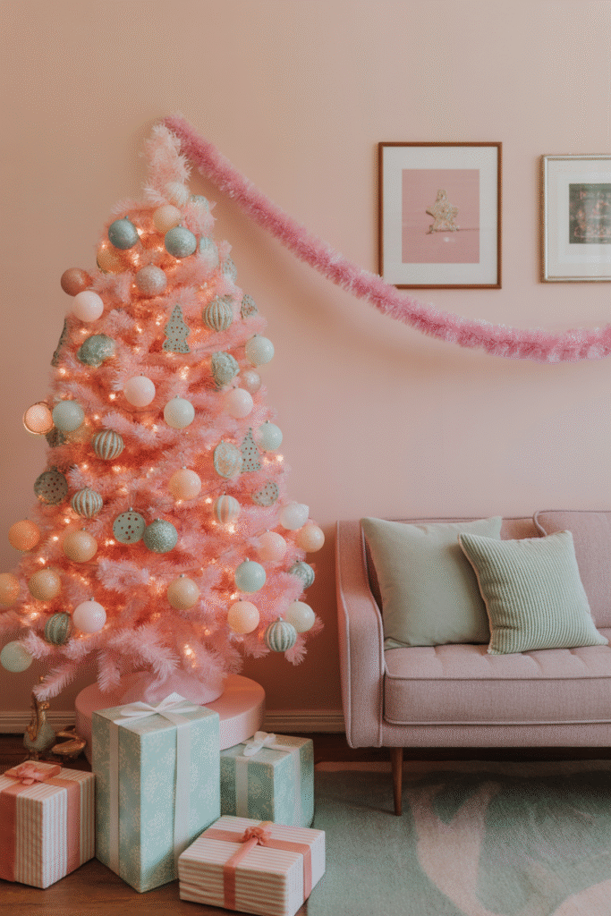 Nostalgia never felt so stylish. Bring back tinsel, glass baubles, and pastel string lights, but arrange them with modern symmetry.