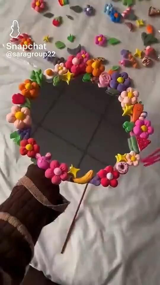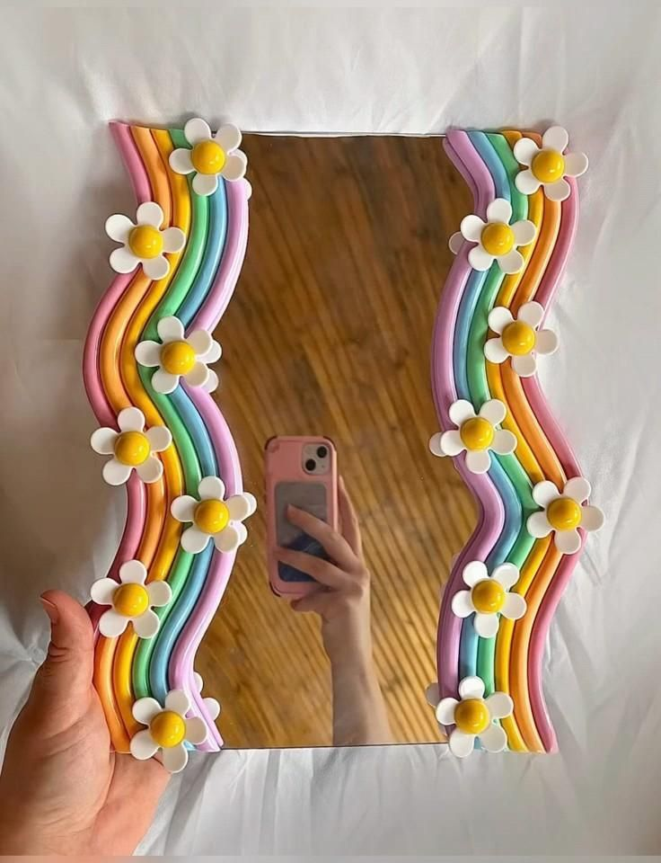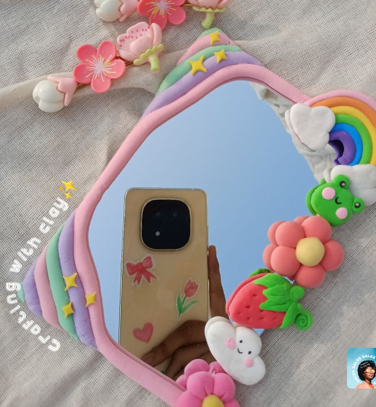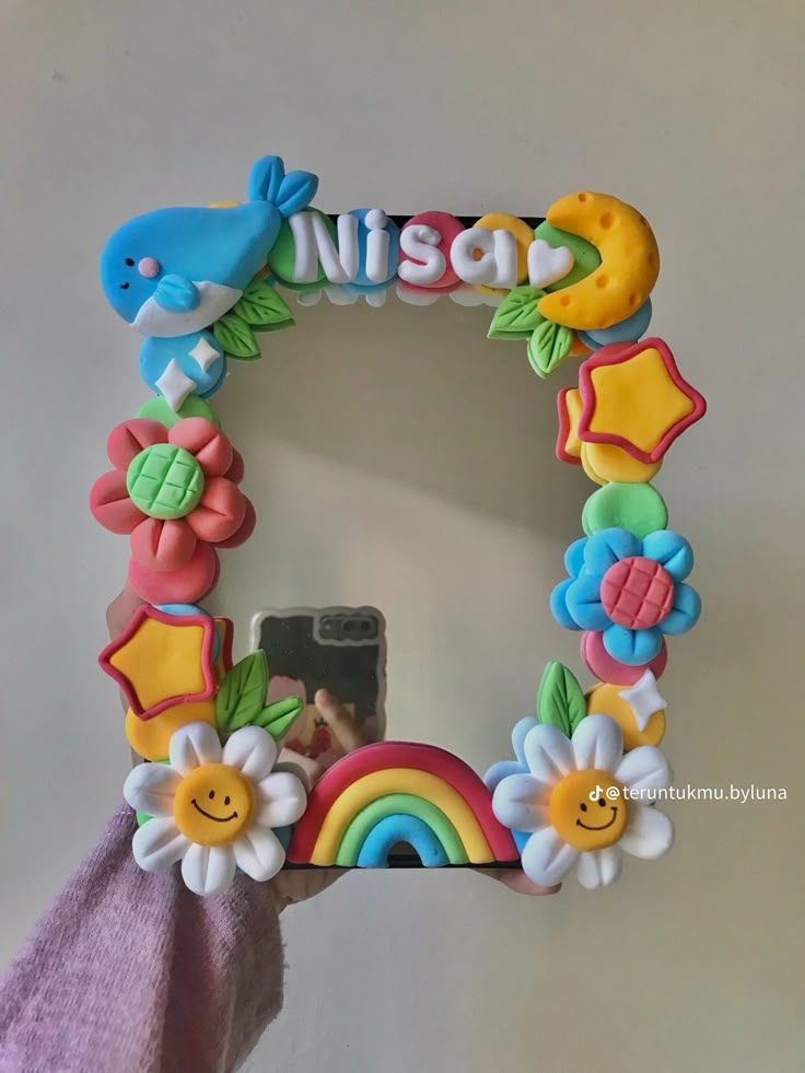 This one instantly explains why people keep saving clay mirror pins late at night. The colors are unapologetically cheerful, the shapes are soft and friendly, and the little personalized name detail pushes it from “cute craft” into keepsake territory.