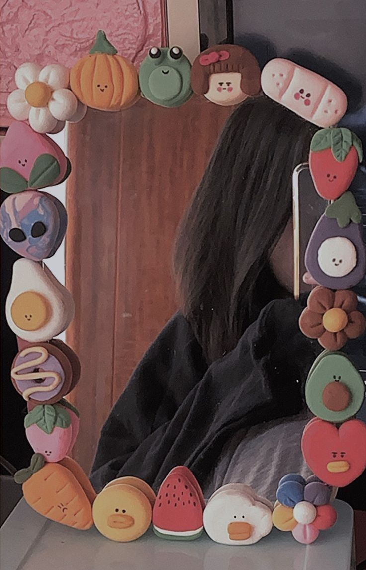This mirror feels like someone turned their favorite sticker sheet into a frame and somehow made it look intentional. Every clay piece has a tiny face, a soft shape, and just enough spacing to keep the whole thing playful instead of chaotic.