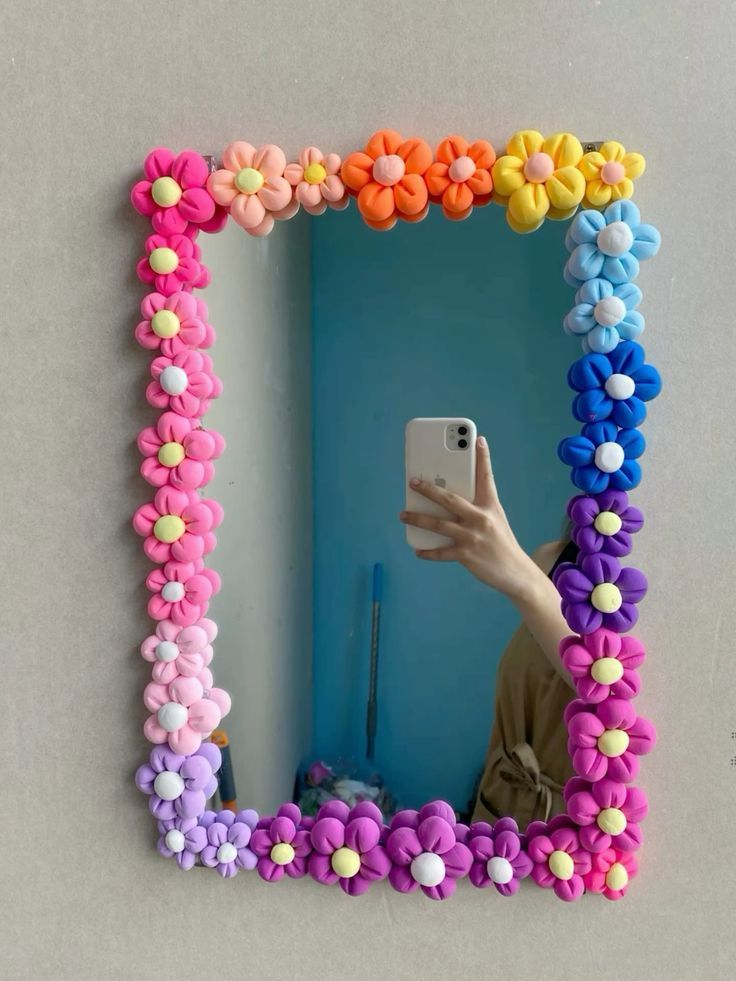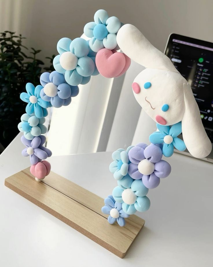 This mirror is a masterclass in knowing when to stop. There’s a lot happening — flowers, soft squiggles, pastel dots — but nothing feels piled on. The spacing does the work. Each clay element gets room to breathe, which keeps the overall look calm instead of crafty-chaotic.