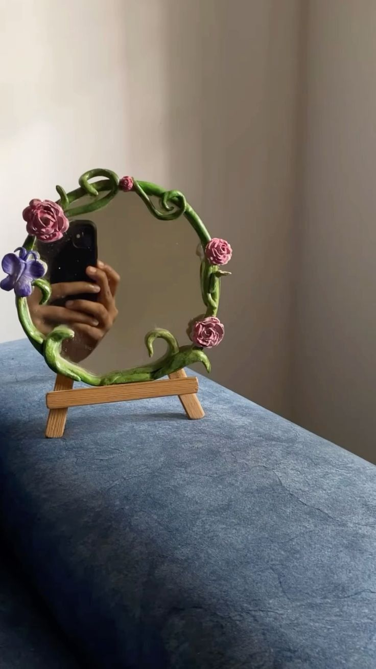 This mirror gets why small decor matters. It’s compact, grounded, and clearly meant to live on a desk — but the clay florals keep it from feeling purely functional. The scale is spot-on: decorative enough to feel special, restrained enough to stay useful.