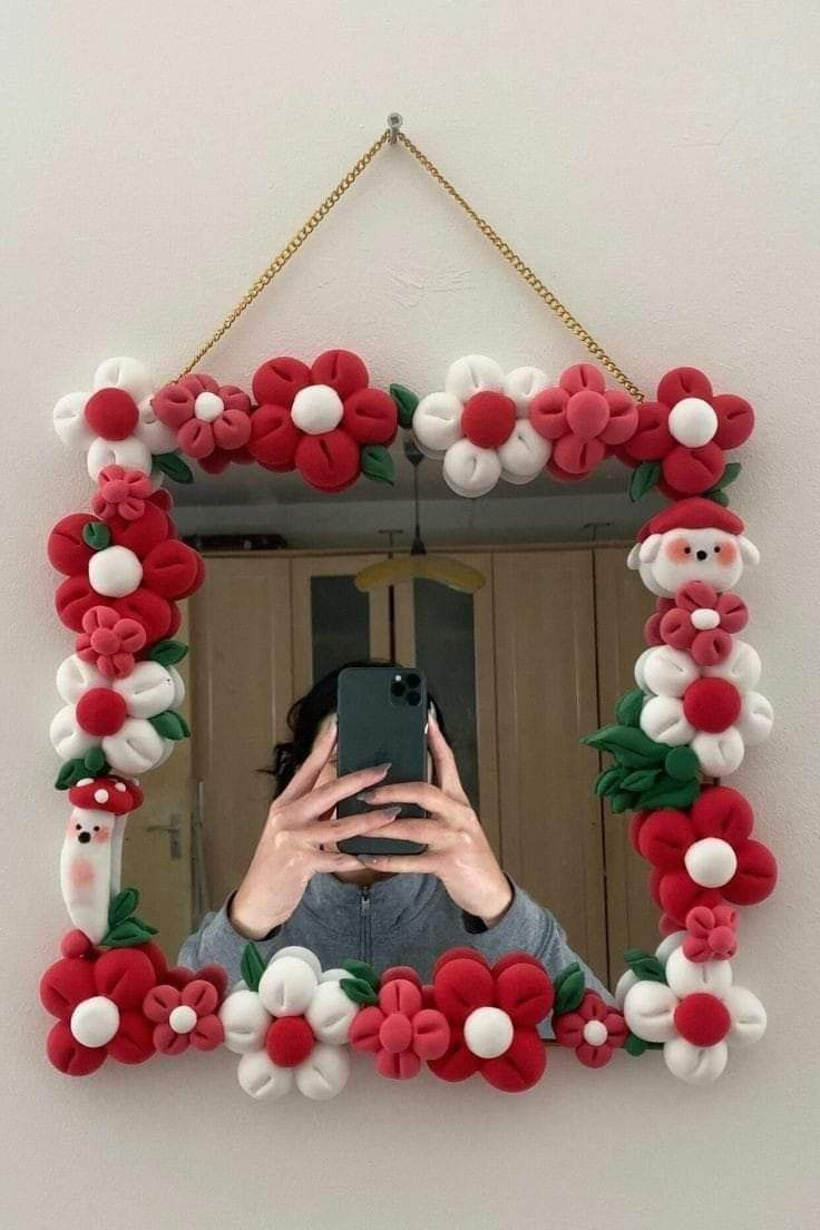 This mirror lands somewhere between festive and timeless. The red-and-white palette is doing a lot of emotional work here — warm, nostalgic, and instantly eye-catching — while the chunky floral forms keep it grounded in handmade charm rather than seasonal kitsch.