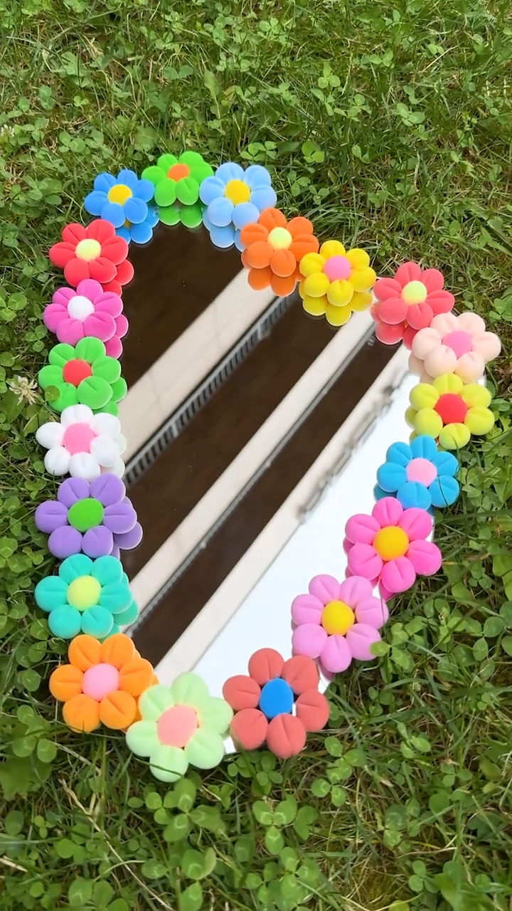 This mirror feels like it was made outside on a good day — and that context matters. The grass backdrop only amplifies what’s already working here: bold colors, chunky petals, and an unfiltered sense of happiness. There’s no irony, no softening, no restraint — just color doing what color does best.