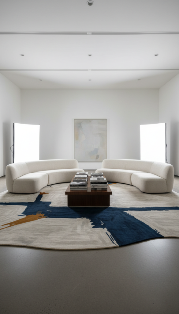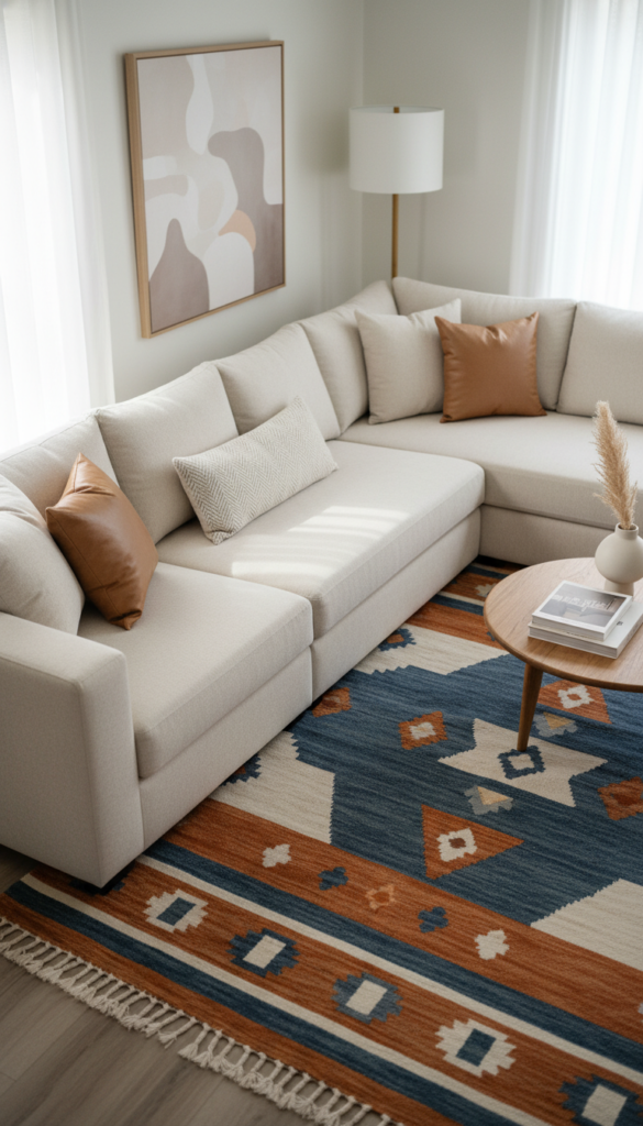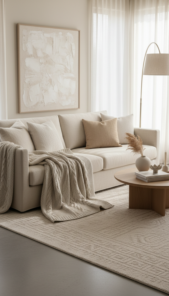A patterned rug adds character without fighting the calmness of cream. It also solves the “all-neutral” flatness problem fast.