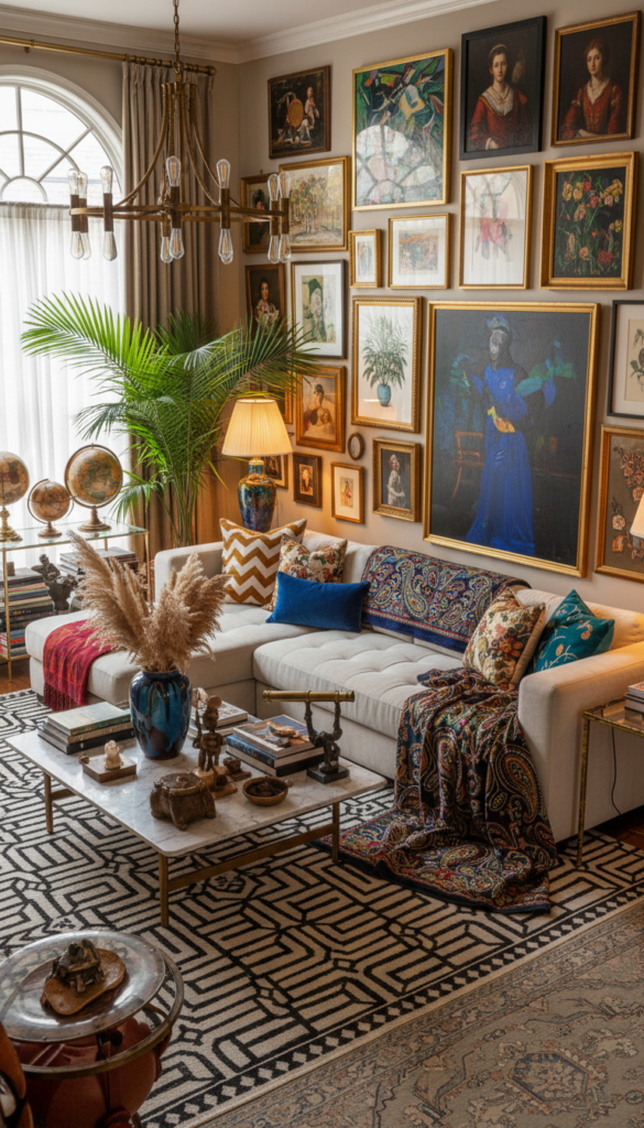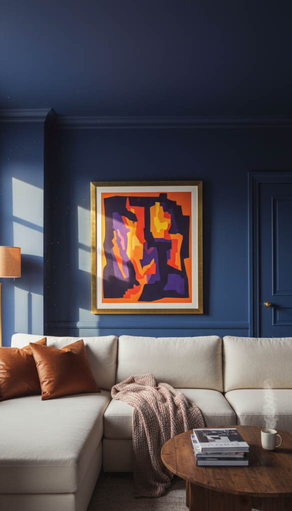 - Contrast can come from dark frames, matte black metal, moody paint, bold art, or a patterned rug.