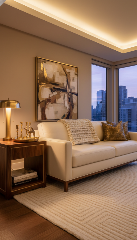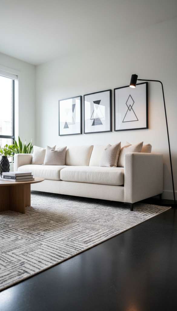 Extra polish: add a large framed mirror or oversized art above the sofa to anchor the wall.