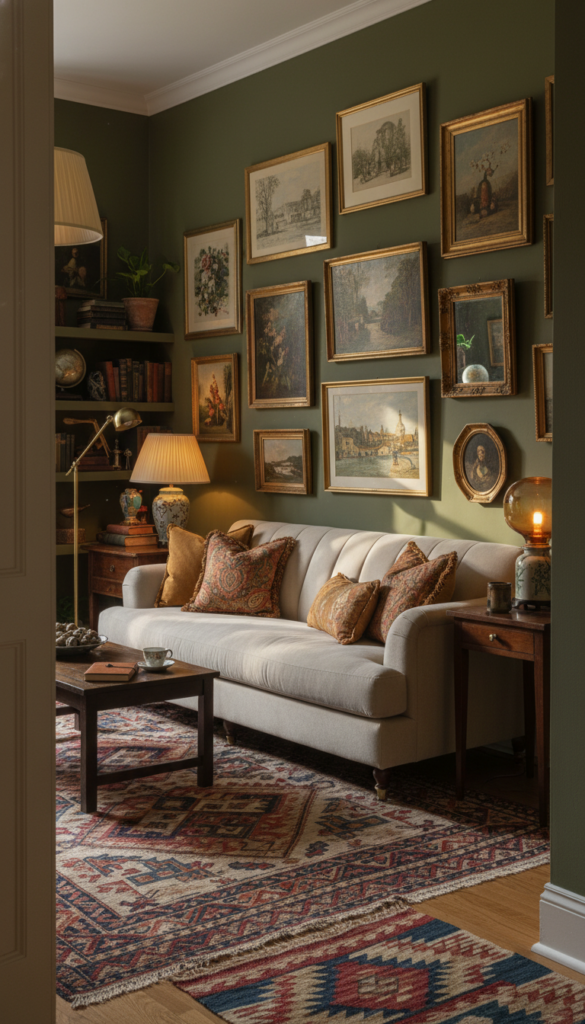 - Deep wall color (charcoal, olive, aubergine, ink)