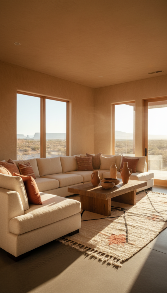 This style loves sun-washed neutrals and earthy accents. It works especially well for ivory couch living room decor and warm cream tones.