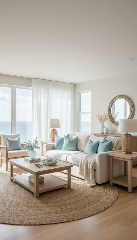 Skip the obvious nautical cues and aim for airy sophistication. Cream upholstery plus light wood reads fresh and calm.