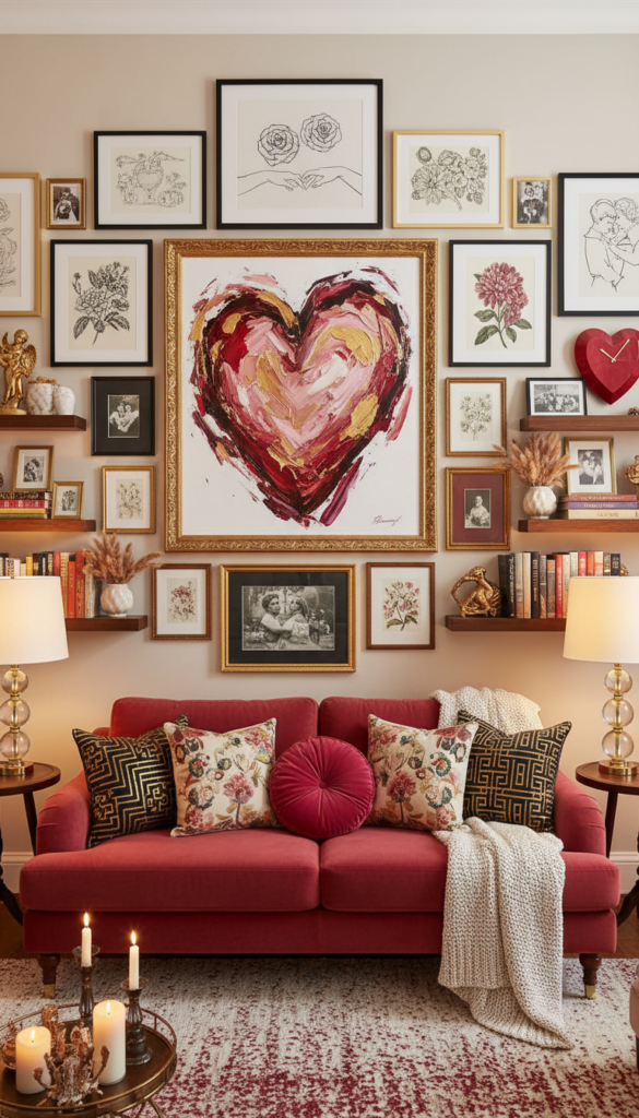 - Add one bold heart piece (metal wall art, sculptural heart, or abstract canvas) as the anchor.