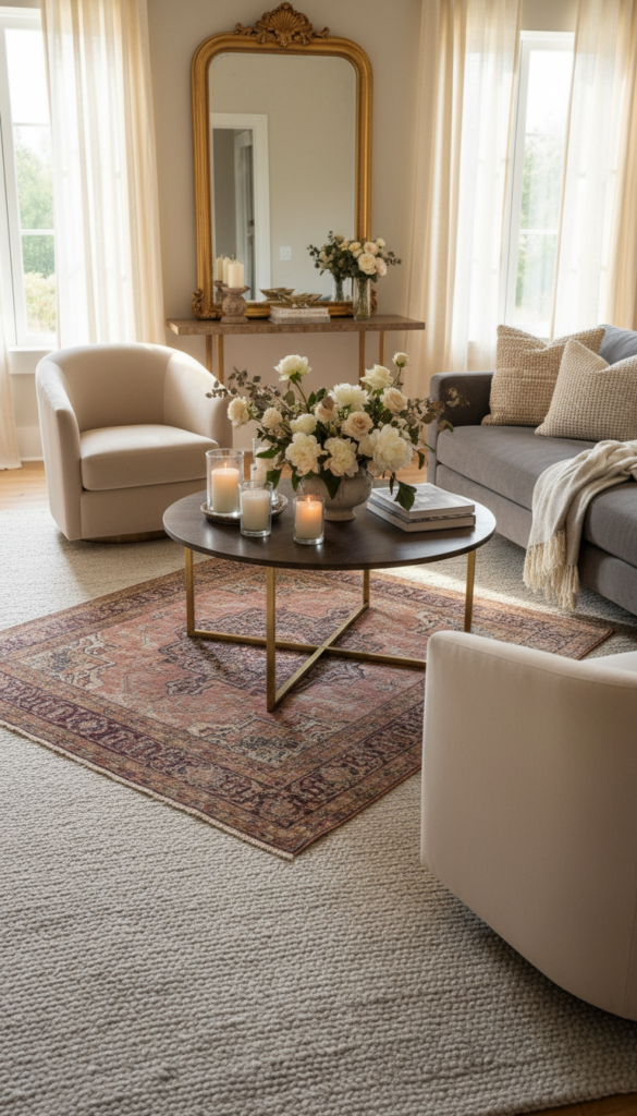 - Top layer: smaller accent rug in burgundy, rose, or a faded Persian pattern