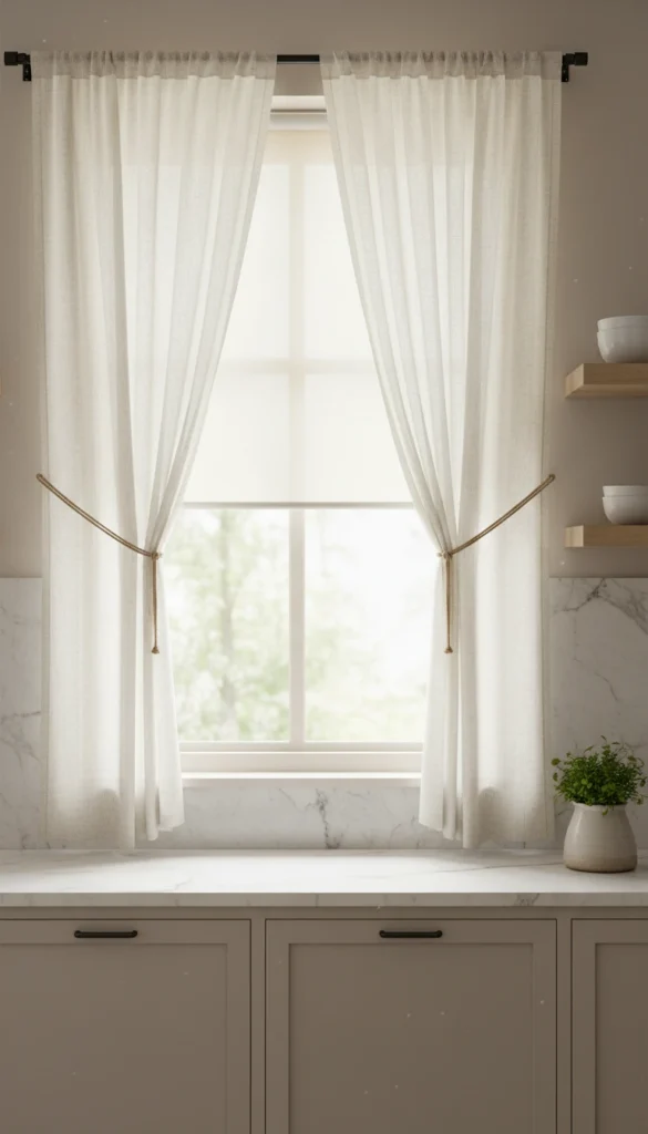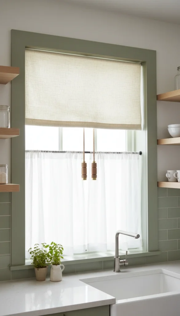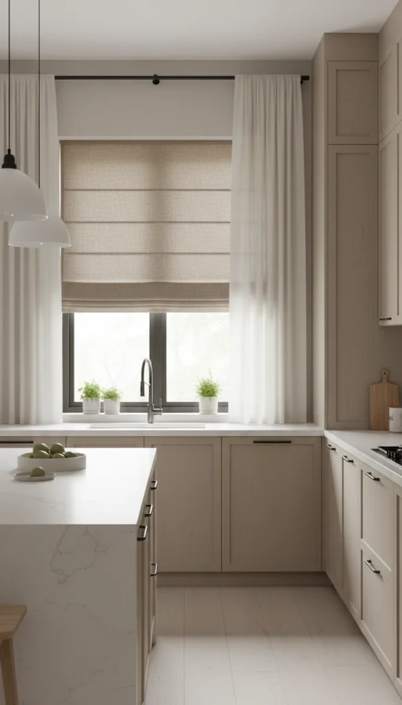 This layered combo works in almost any style of kitchen and feels like the grown-up version of blinds. It reads clean, tailored, and quietly luxe — ideal for Modern Kitchen Window Coverings that stay out of the way of cabinets and backsplash.