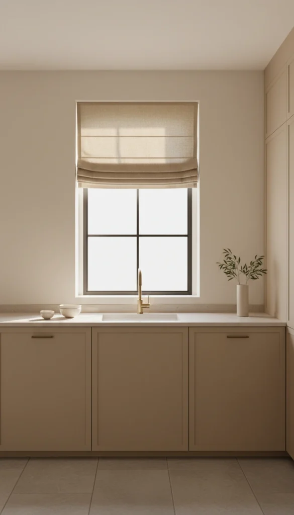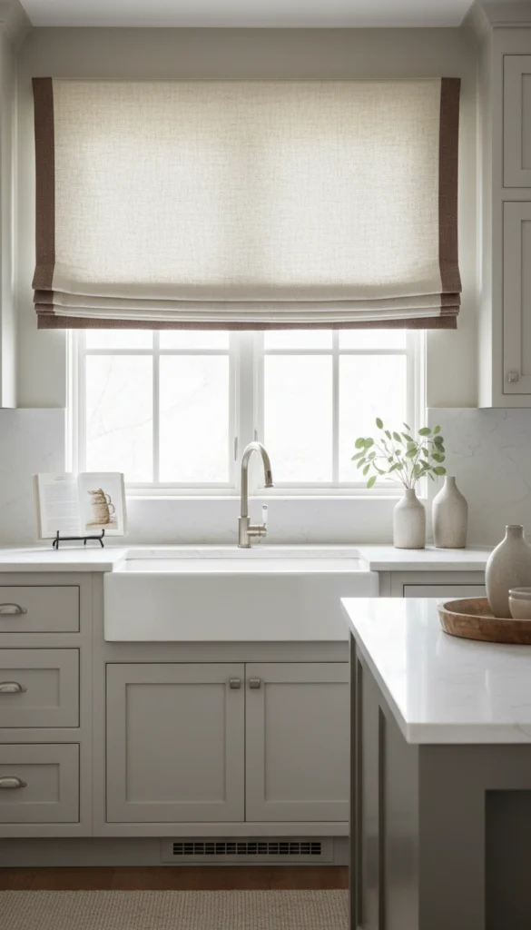 Roman shades work beautifully for Small Kitchen Window Treatments, since they stack neatly and show off your tile when raised. They also feel elevated enough for a kitchen with integrated appliances and sleek cabinetry.