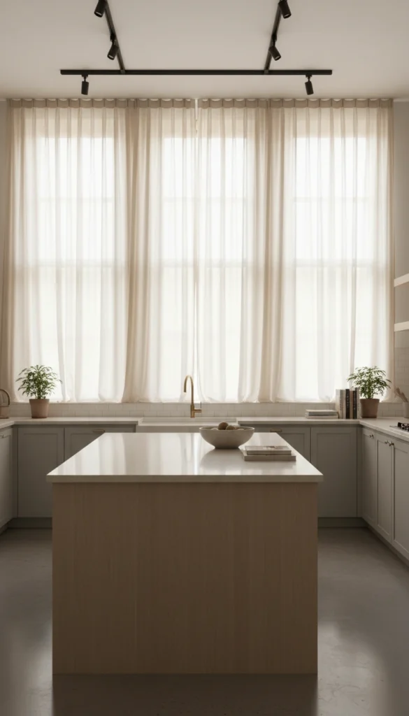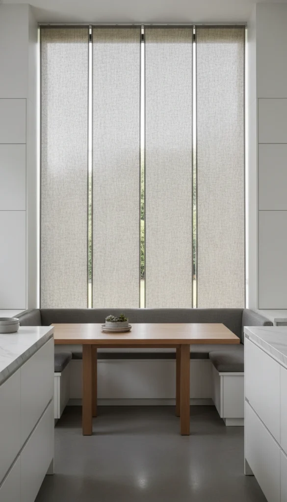 For extra-wide or floor-to-ceiling kitchen windows, classic curtains can feel heavy. Panel tracks offer a sleek alternative.