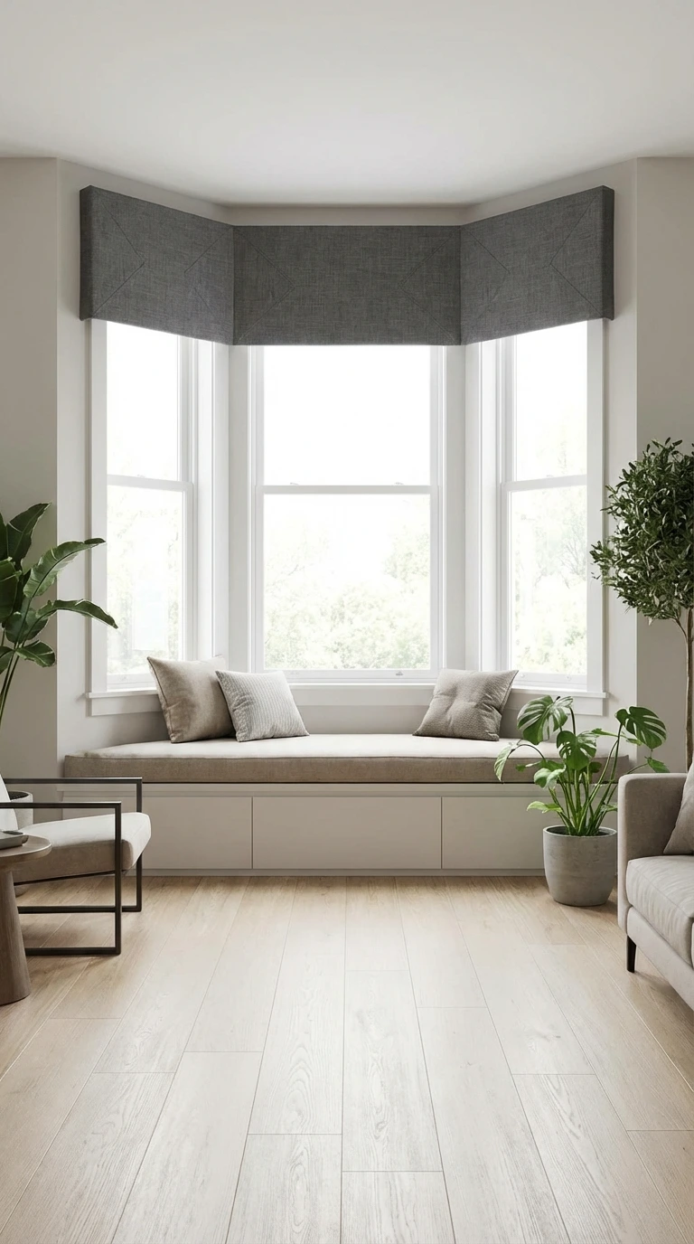 Bay windows can feel tricky, but this is exactly how to make them look intentional instead of awkward. The tailored valance follows the angles cleanly, creating a smooth visual line that ties all three windows together.