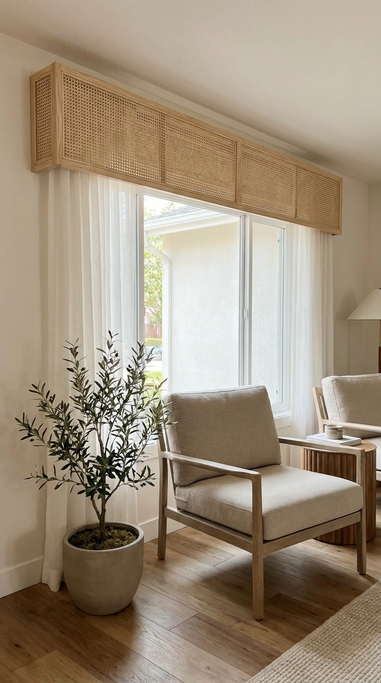 This is a perfect example of how texture can completely change the feel of a room without adding visual clutter. The rattan valance brings warmth and softness while still feeling modern and intentional.