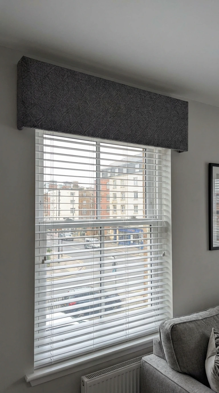 This is exactly how a valance should work when blinds are involved — clean, calm, and quietly doing its job. The fabric-covered box softens the hard lines of the blinds without stealing attention, which is what makes this look feel intentional instead of “added later.”