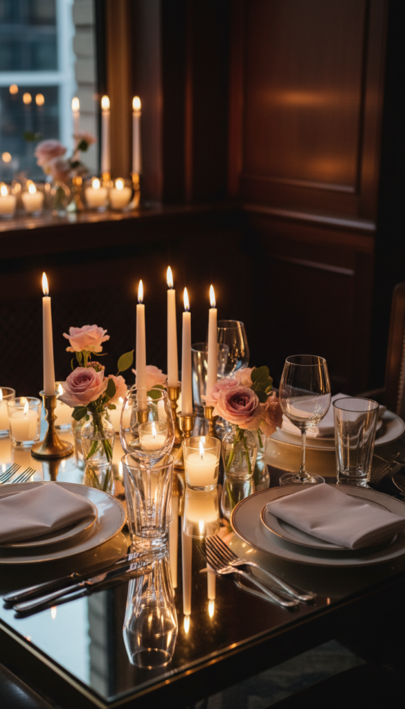 A mirrored runner reflects candlelight upward, instantly doubling the ambiance and making even basic tableware look premium.