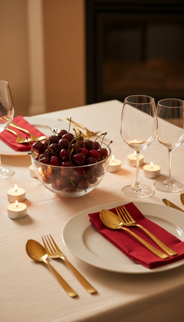 Cherry accents—glassware, fruit, or napkins—bring a vibrant Valentine mood without relying on hearts everywhere.