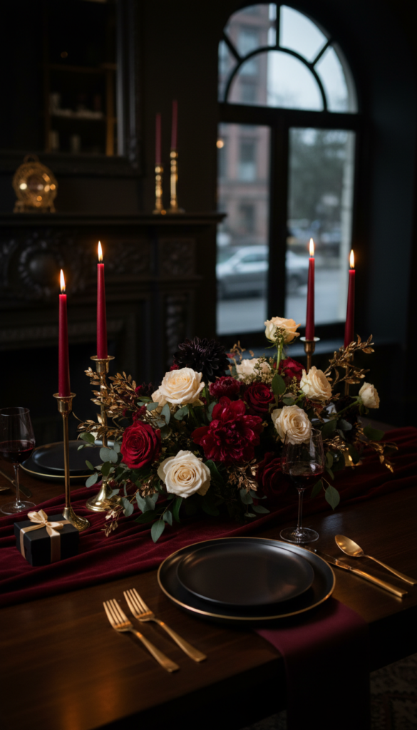 If pink isn’t your vibe, go cinematic: deep tones, dark florals, and glowing candlelight.