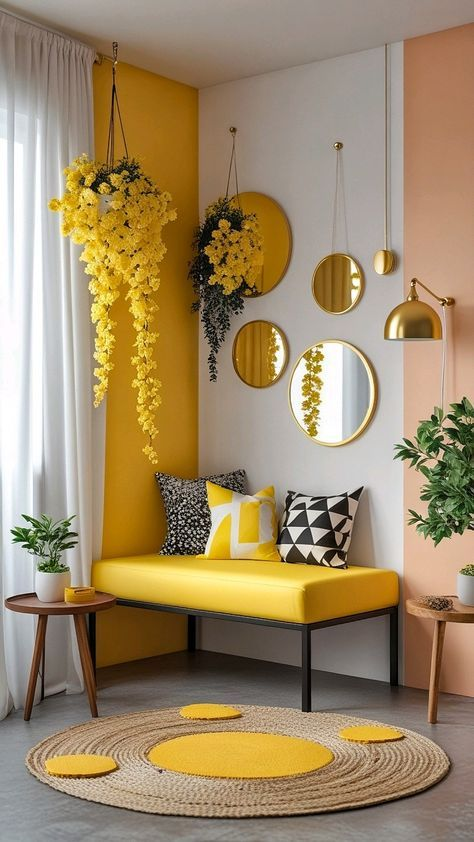 - Yellow accents do the heavy lifting here. They instantly wake up a space without overwhelming it. Think cushions, bench seating, or a small rug rather than full walls if you want flexibility.