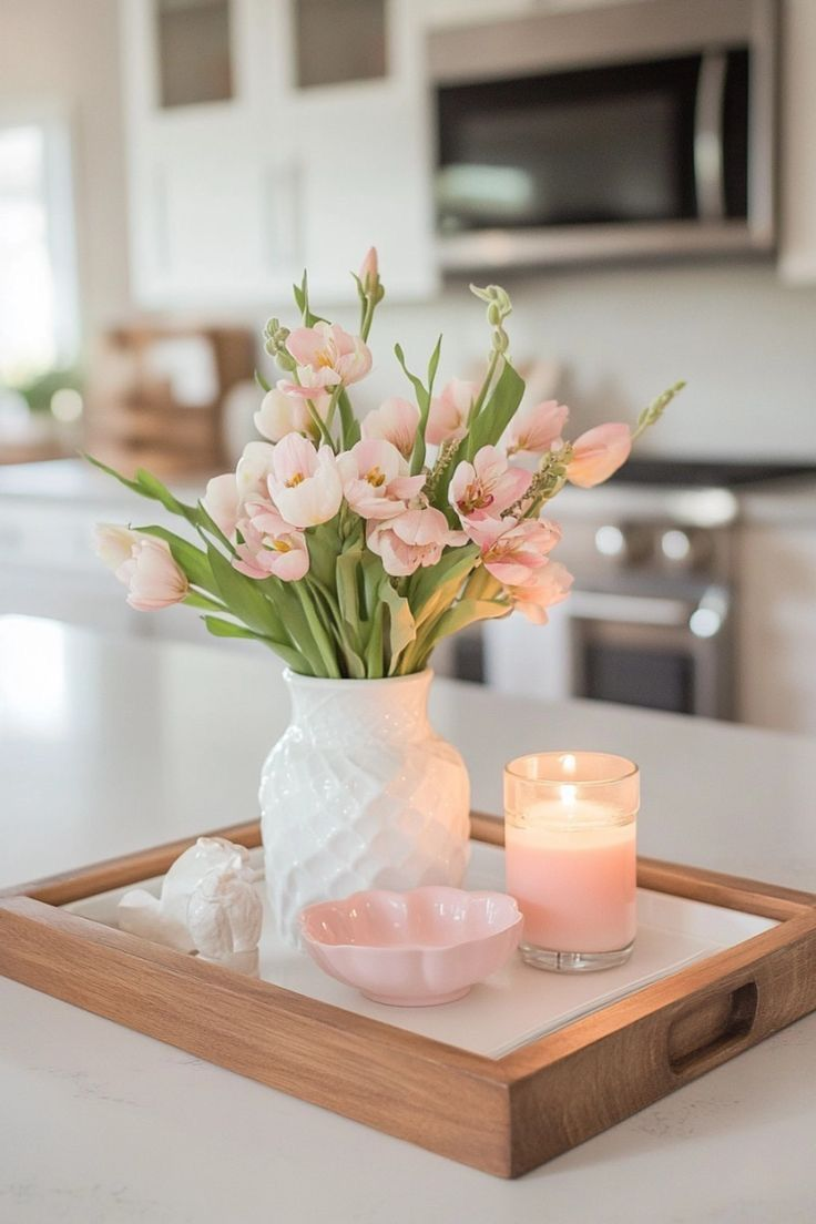Steal this idea: group three items with different heights on a tray — one floral, one soft accent, one glow element — for an easy spring refresh.