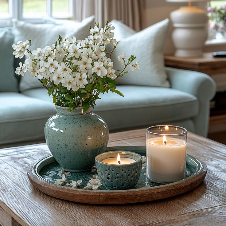Steal this idea: create one calm “pause spot” in your living room — a tray, a candle, and one floral element is more than enough.