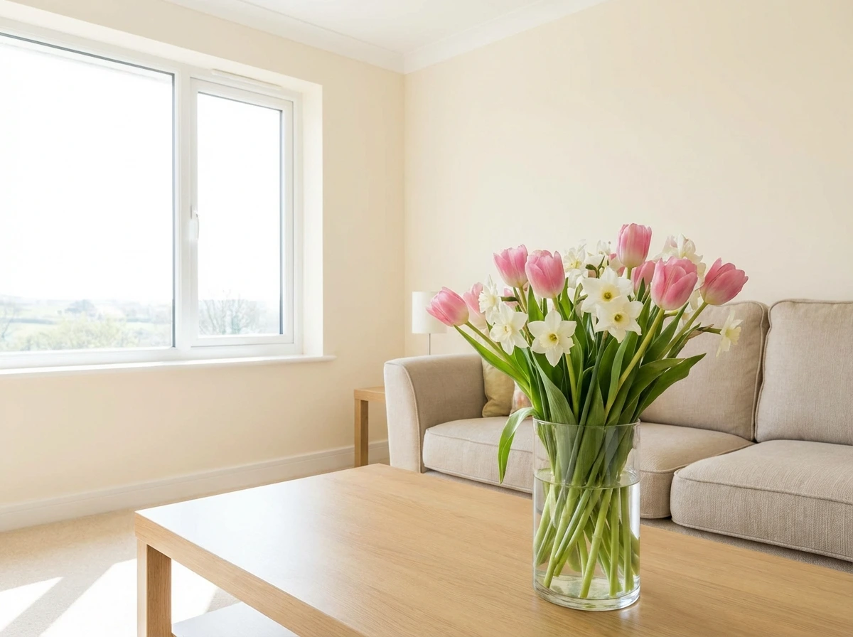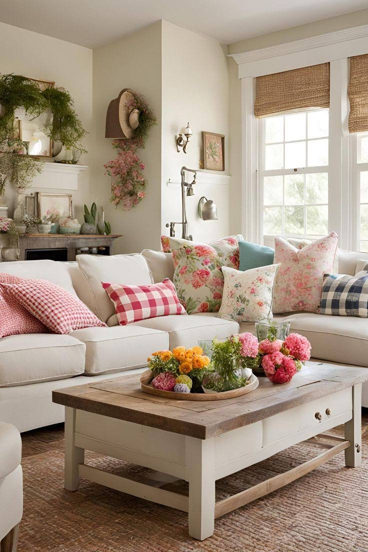 Steal this idea: mix soft florals with neutral furniture to keep the look cozy, not busy — especially perfect for spring living rooms that should feel calm and welcoming.