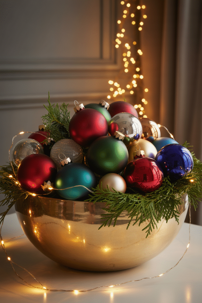 Grab a big gold or silver bowl, fill it with ornaments, add a few sprigs of greenery, and boom—you’ve got instant holiday glam. Bonus: you can sneak in some fairy lights for sparkle. IMO, this is the fastest way to look like you put in effort when you actually didn’t.